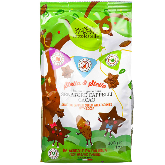 Βιολογικά νόστιμα μπισκότα Stella & Stello με κακάο, αλεύρι Senatore Cappelli, 13% εξαιρετικό παρθένο ελαιόλαδο. Δεν περιέχουν γάλα και αυγά, παρά μόνο φυτικά συστατικά. Σε σχήμα αστεράκι, αρέσουν πολύ στα παιδιά.