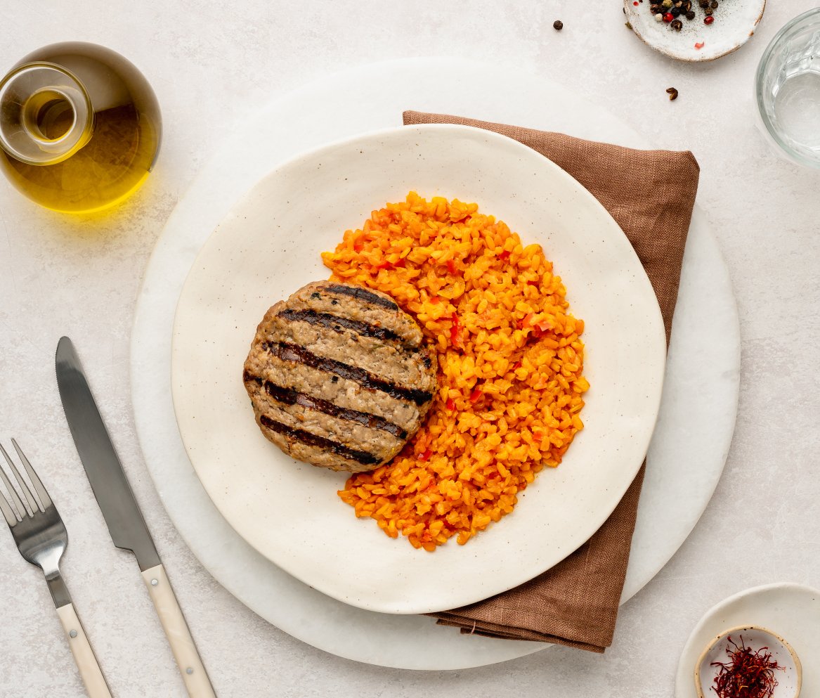Μπιφτέκι από βιολογικό κρέας μοσχάρι-χοιρινό (Ευβιότοποι) με καστανό ρύζι και κρόκο Κοζάνης WORTHEAT