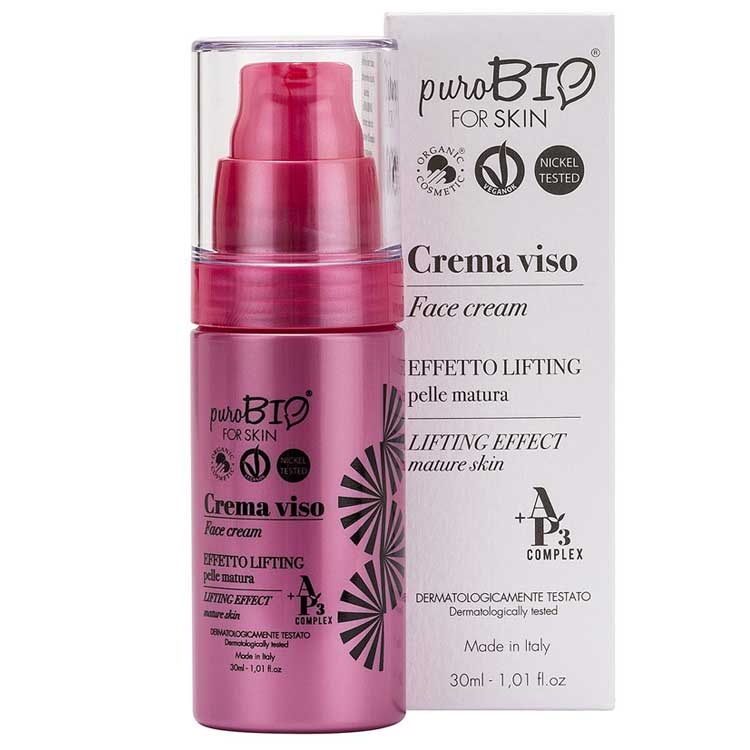 Η Lifting Effect Face Cream for mature skin της σειράς Ap3® FOR SKIN της PuroBIO είναι ιδανική για τα ώριμα δέρματα και τα πρώτα σημάδια γήρανσης. Πρόκειται για μία ενυδατική κρέμα που δημιουργήθηκε για να χαλαρώνει και να μειώνει τις γραμμές έκφρασης και τις ρυτίδες, ελαχιστοποιώντας οπτικά την εμφάνισή τους. Βασισμένη στα θρεπτικά συστατικά του έλαιου καρύδας και του βούτυρου κακάο, κάνει το δέρμα απαλό και ελαστικό, ενώ οι ενυδατικές ιδιότητες του υαλουρονικού οξέος σφίγγουν το δέρμα, δίνοντάς του λάμψη. Οι ευεργετικές αντιοξειδωτικές ιδιότητες του συμπλέγματος Ap3® και το εξα-πεπτίδιο (αντίστοιχο του botox) δρουν βαθιά και μειώνουν από μέσα το σχηματισμό των ρυτίδων. Σε αξιολόγηση διάρκειας 30 ημερών, που πραγματοποιήθηκε σε δείγμα 20 γυναικών, στο 95% σημειώθηκε βελτίωση της εμφάνισης του δέρματος, ενώ το 90% παρατήρησε θεαματική αποτελεσματικότητα της θεραπείας κατά της ρυτίδωσης.