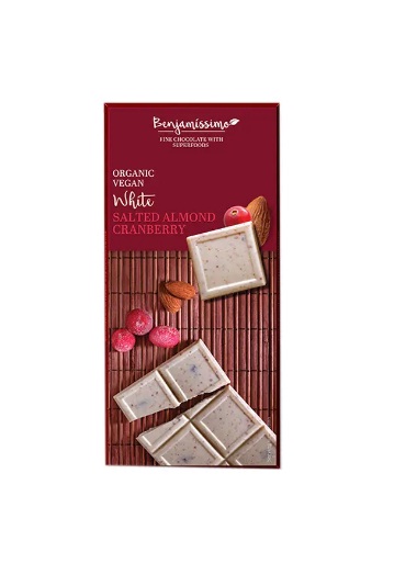 Βιολογική Λευκή σοκολάτα με αλατισμένα αμύγδαλα και κράνμπερις 70gr BENJAMISSIMO